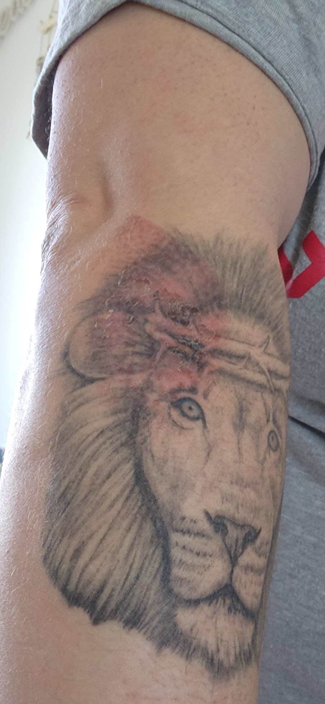 I’m thankful to hear God’s voice. I have been criticized in the past. God wouldn’t tell you that. Or God wouldn’t say that. That’s not God, that’s Satan. I know my Lord’s voice. And I’m learning to listen to him on the first time. (Trying to. Cause I’m not the sharpest tool in the shed and I’m a simple minded blonde. But thankfully God knows that.) The first picture is when I initially got the tattoo done, the middle picture is after the burn, just a large scorched area (nice picture before the blistering and scabbing) and the final picture shows the scaring on the crown of thorns. I thought God’s placement was pretty perfect too, thought His plans always are perfect.